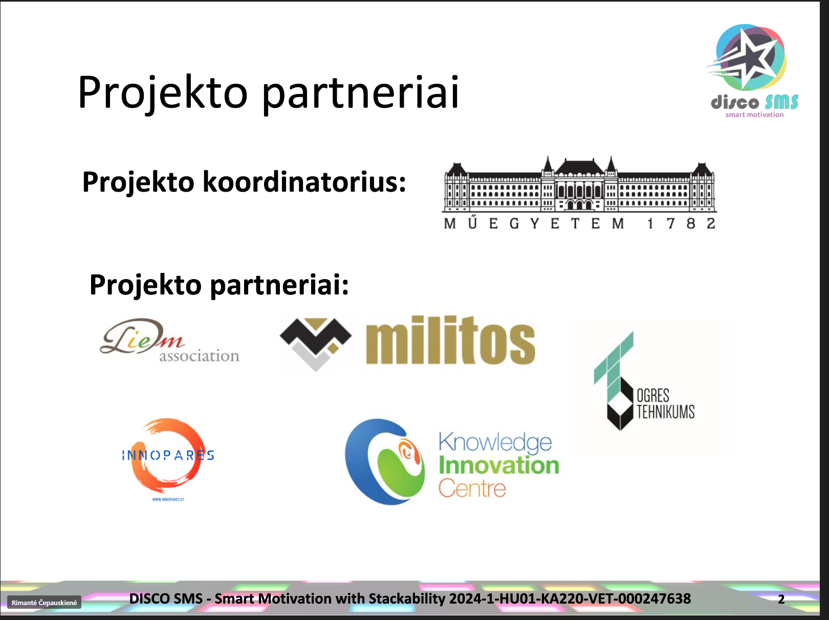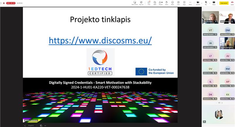 Lapkričio 21 d. LieDM organizuotos Nacionalinės atvirojo ir skaitmeninio mokymosi savaitės metu pristatytas projektas “Digitally Signed Credentials – Smart Motivation with Stackability” (Disco-SMS). Seminaro dalyviams pristatytas projekto tikslas bei jau pasiekti rezultatai. Supažindinta su projekto partnerių parengtais straipsniais bei mokomąja medžiaga skirta pirmam ir antram moduliui, aptarta skaitmeninių ženklelių išdavimo platforma DiscoPlay, taip pat parengti moduliai, skirti nuotoliniam mokymuisi, kurie bus pateikiami ne tik anglų, bet ir vengrų, latvių, ispanų, graikų ir lietuvių kalbomis.